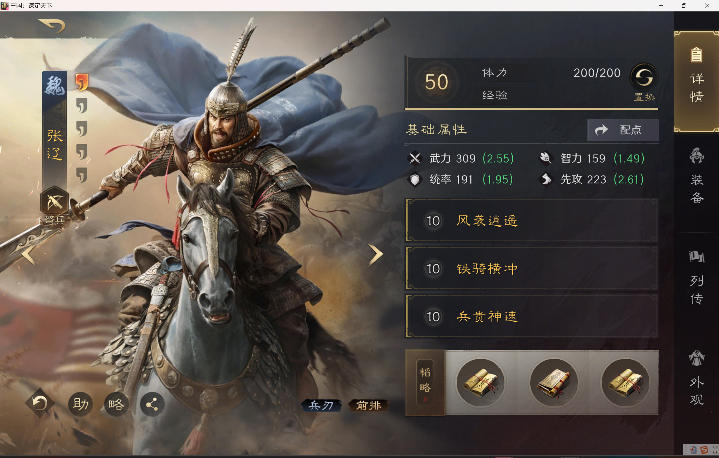 张辽战法:风袭逍遥+铁骑横冲+兵贵神速。