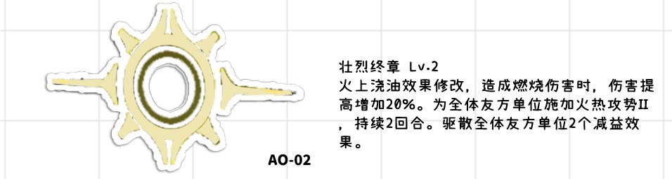 ●火上焦油增加造成燃烧伤害20%,也是朴实无华的增伤,不过只有两个回合需要注意一下●为全体施加火热攻势2,这个效果很强力,火热攻势现阶段本来就是游戏中除了爆伤穿防buff之下的超优质buff,不过和火上焦油一样只有两回合的持续时间,不过火上焦油和火热攻势都需要注意,因为燃烧队是以支援射击为主要伤害的队伍,所以火热攻势和火上焦油实际上的持续时间有3个回合,只需要第一回合琼玖释放完技能再让维克托开制胜技就行,虽然持续回合增加了但依旧没有全覆盖,不过加成确实也是非常高的了。同时该buff还能给可露凯等需要火热攻势的角色使用,不过如果队伍中只有一个大c的话,可以用科谢尼娅来解决火热攻势不足的问题,也就是在这种阵容中维克托的火热攻势就没有太过于重要了。