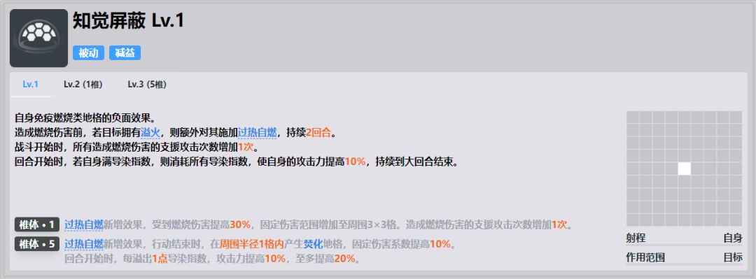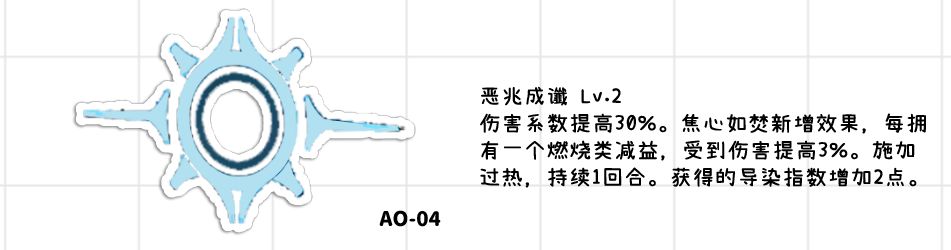 ●过热自燃提供焚化地格效果一般,维克托的铺焚化地格能力已经足够了,主要还是固定伤害的提升,可以再进一步增加自己以及琼玖的伤害。●回合开始时每溢出一点导染加10%攻击最多20%,配合上3、4椎的效果,一般循环中就可以做到2回合一次的20%攻击力加成,毕竟攻击加成算是比较强力的buff,对于自己的提升还算不错。