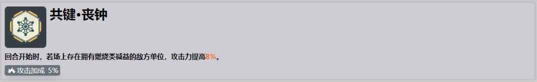 ●游戏先版本顶尖共键,在功能性需求一般,伤害为主要内容的环境下,8%的攻击加成以及共键自带的5%攻击加成是游戏中比较稀有的属性,在工会战buff稀释严重的情况下,攻击加成带来的提升非常的明显,是超过伤害加成的,所以该共键的强度很高,不过需要绑定能够施加燃烧类减益的角色。