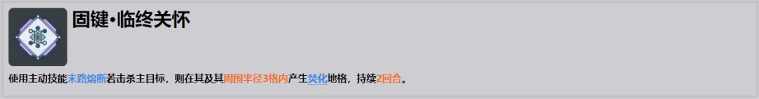 ●推图中或者是有小怪的boss战中增加铺地格效率的技能,现在看起来用处不大,维克托自身就拥有高效率的铺地格能力,同时末路熔断在敌方没有溢火的情况下倍率没有那么的高。所以该固键性价比不高。