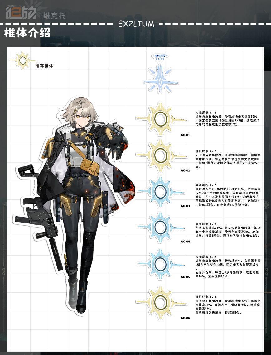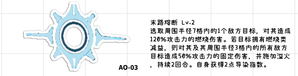 ●维克托铺地格的主要手段之一,对方受到燃烧伤害后就能产生焚化地格,焚化地格提供的不止只有燃烧弱点,还能施加溢火以及收到燃烧伤害提高,是非常强力的辅助效果,地格提供的溢火也能像末路熔断一样弥补没有三椎琼玖的溢火队的挂溢火效率以及更加容易触发维克托的过热自燃。●100%倍率的伤害中规中矩,但依旧是精准伤害不会亏精准支援射击。●维克托该技能自己的燃烧伤害就能触发焚化地格,所以可以直接铺地格。