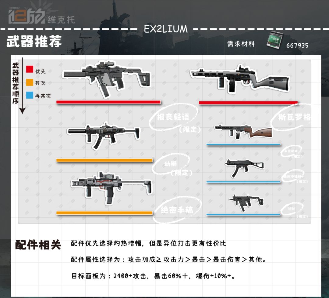 ●配件选择:优先灼热增幅,其次选择异位打击。●不过由于刷灼热增幅性价比太低,成型太慢,异位打击实际性价比更高●现阶段所有角色以输出为主,因为维克托在低椎的情况下暴击收益比较低,所以优先还是堆攻击,在此基础上追究暴击。推荐顺序为:攻击加成≥攻击力>暴击率>暴击伤害>其他●目标面板为:2400+攻击,然后暴击60%+,爆伤+10%+。