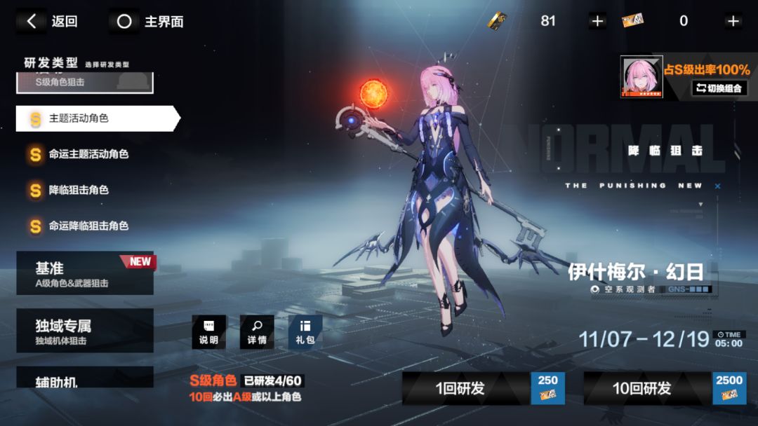 · 狙击武器研发:可以选择特定角色的专武进行抽取,30次保底六星武器,10连保底五星武器,咱们捞喜爱角色的专武就要在这个池子里面。
