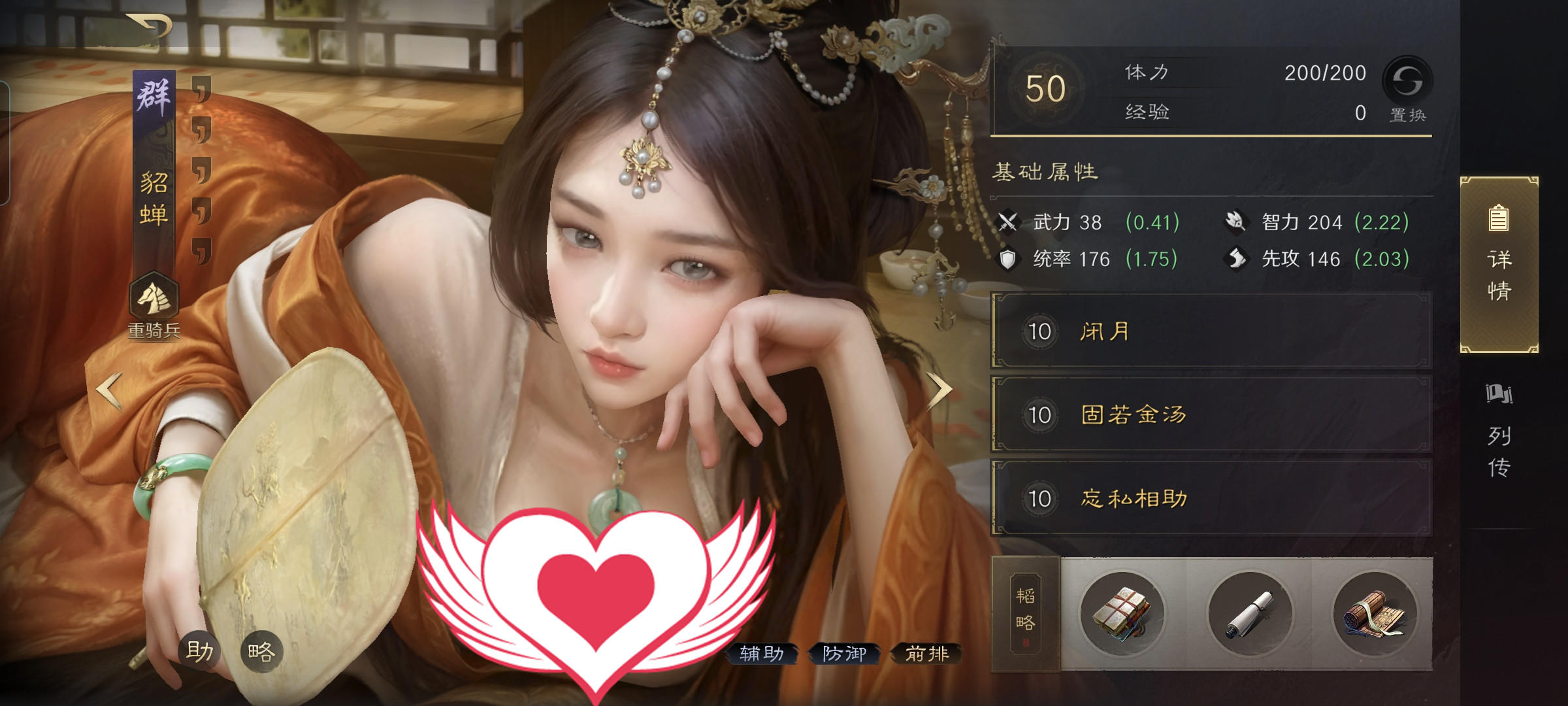 貂蝉战法:闭月+固若金汤+忘私相助。