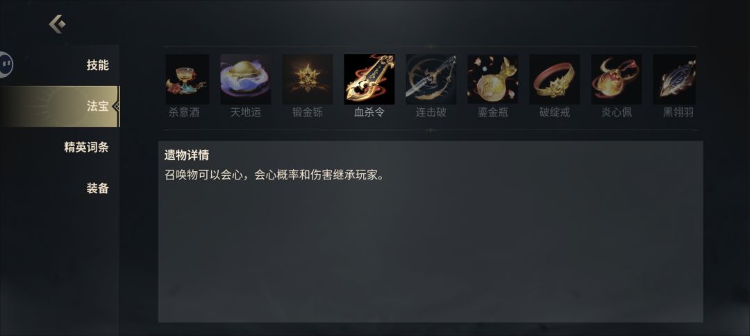法宝:血令杀和月华佩必备,如果可以拿到改命坠,把钟馗的主属性改成体魄也可以(没有也没关系,毕竟不靠这个输出),其他随意