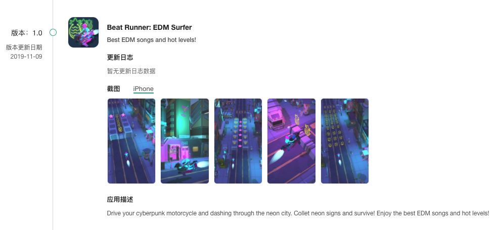 实际上,我们从第一个版本开始就在构思一个未来世界,想象着玩家掌控着节奏去披荆斩棘。在1.0版本时,我们购买了Unity中的一套美术素材去做市场反应的调研。遗憾的是,这个风格并没有被海外玩家接受。在我们反复测试之后,我们采用了现在的美术风格。依旧还是想保持未来感和科技感。Beat Saber是一款十分优秀的节奏游戏,也是一款将未来科技感的美术风格与节奏游戏融合的非常好的游戏。我们自己学习借鉴,然后在游戏中引入激光,背景墙等元素。在过去的一年中,我们在海外受到了广大玩家的欢迎,在游戏获得了商业化的成功之余,遗憾的是,我们似乎停止对游戏更深入的探索。
