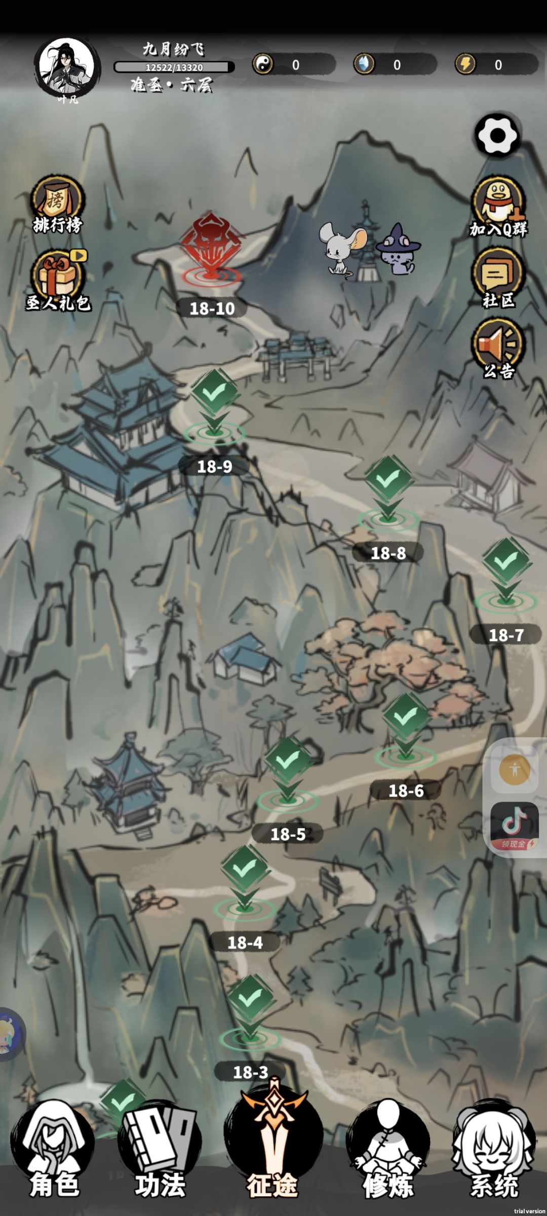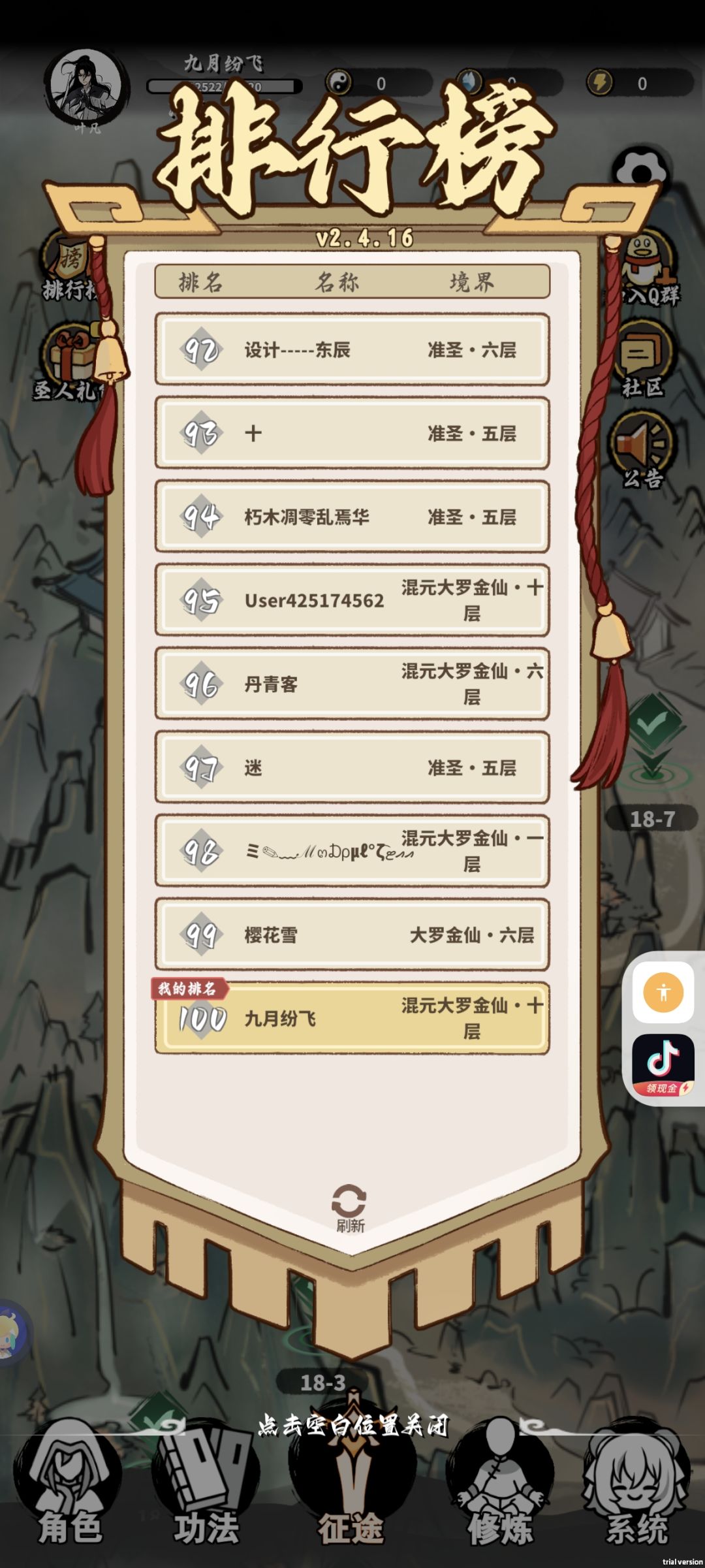 肉盾恢复流,优点是前期练气打化神,筑基打洞虚,洞虚打太乙毫无问题;后期输出乏力,卡在18-1。被雷修一刀秒,雷修全数值怪,平衡差距很大。不过随便上个榜还是可以的(前面清一色雷修)😂