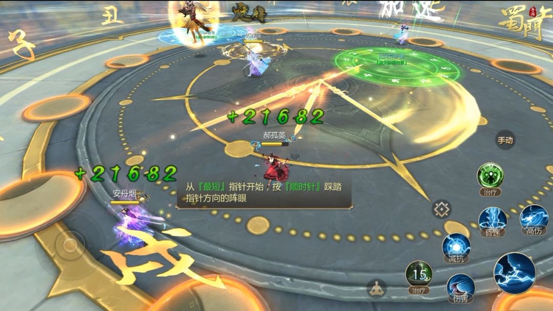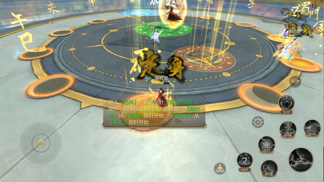 应对方法:首先仔细观察中场的时针和提示文字,这里会有不同的可能性。从最短或者最长的指针开始,顺时针或者逆时针踩踏相应的阵眼。按照提示去依次踩上相应的阵眼即可破解。