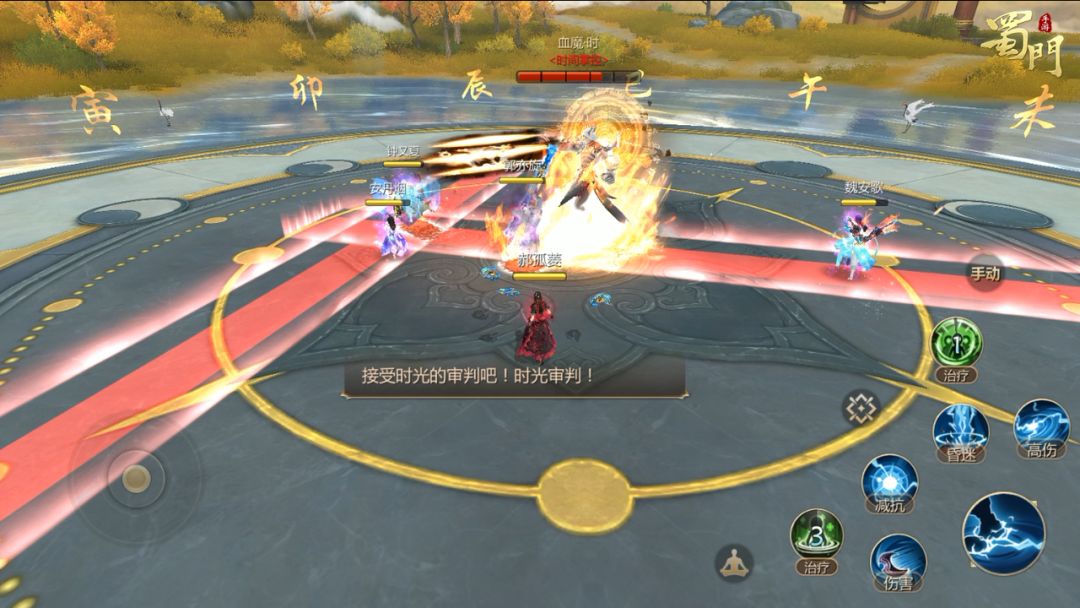 在开打之前,大家也可以轻易的发现,这次的场地是圆形钟表盘,非常契合血魔控制时间的能力,在上面按照时间顺序标有十二时辰的文字。我们统称整个场地中靠外部白色地板的部分为外圈,靠中间深色的部分为内圈。