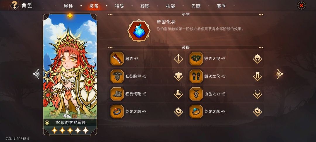 如图所示,萌新只管带帝国化身的圣物就OK了,吃两个套装的收益还是很香的