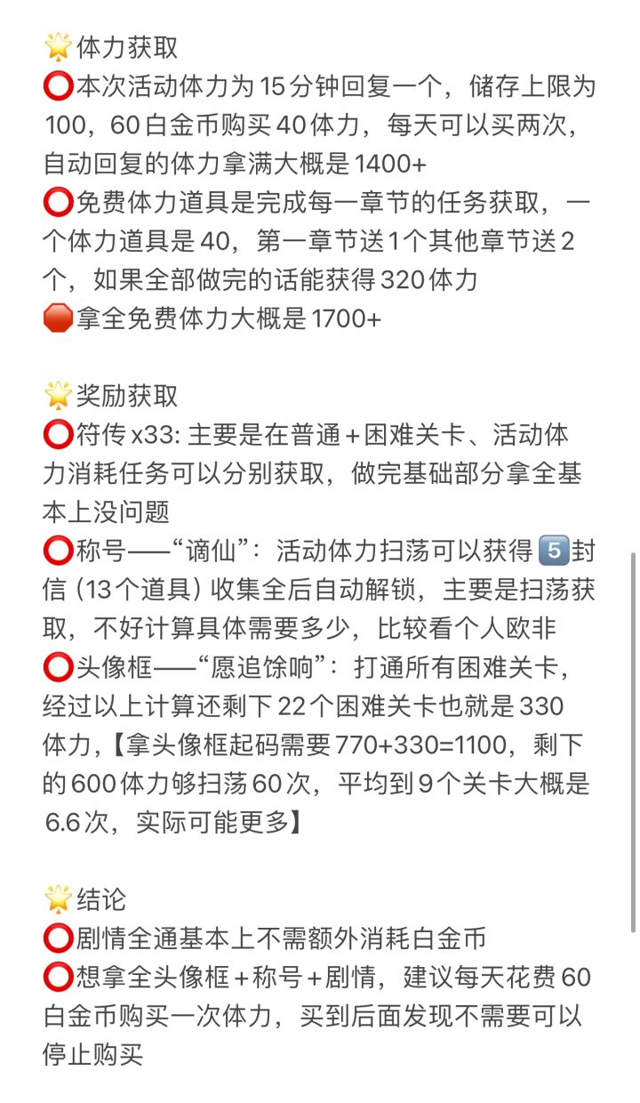 ⭕️想拿全头像框+称号+剧情,建议每天花费60白金币购买一次体力,买到后面发现不需要可以停止购买