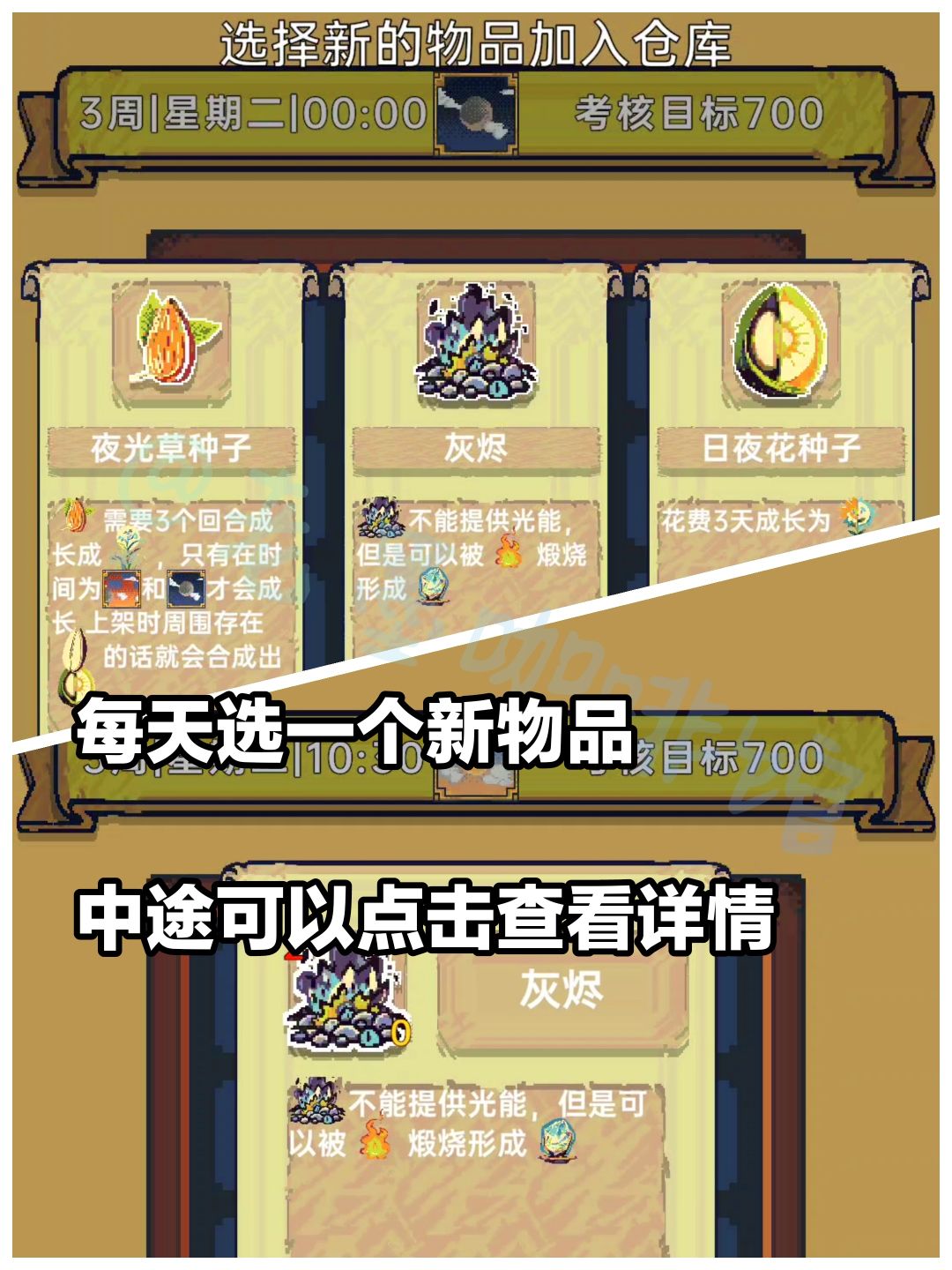 比如先在周围放置枯草,再放🔥,那么火会燃烧材料。⚠️但如果先放🔥,再放枯草,那么并不会产生反应。放置顺序比较重要。🌻时间:游戏中以一周为单位。每天重新放置卡牌。一天结束时可选新卡牌加入牌组。