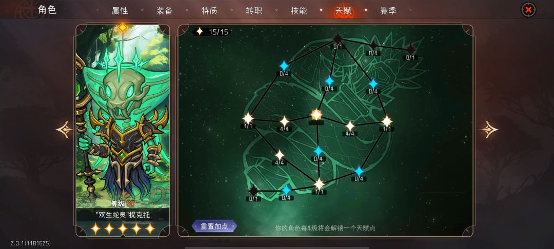 技能选择【伏击蛇】【喷毒蛇】【强化毒剂】,词条优先选择【强化毒剂】的行动点+1剩下的便是伤害加成,伏击蛇数量+1也可以优先拿个,配合赛季词条一下子召唤两条蛇神后裔。