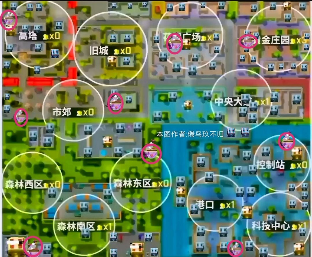 2、森林与市郊(黄色紫色线路)------适合安稳发育:箱子分布不是非常密集,所以人相对较少。建议先去森林,从下(森林)往上(市郊方向)搜刮。当你搜完市郊,有一只海霸王差不多就在你附近出现啦!