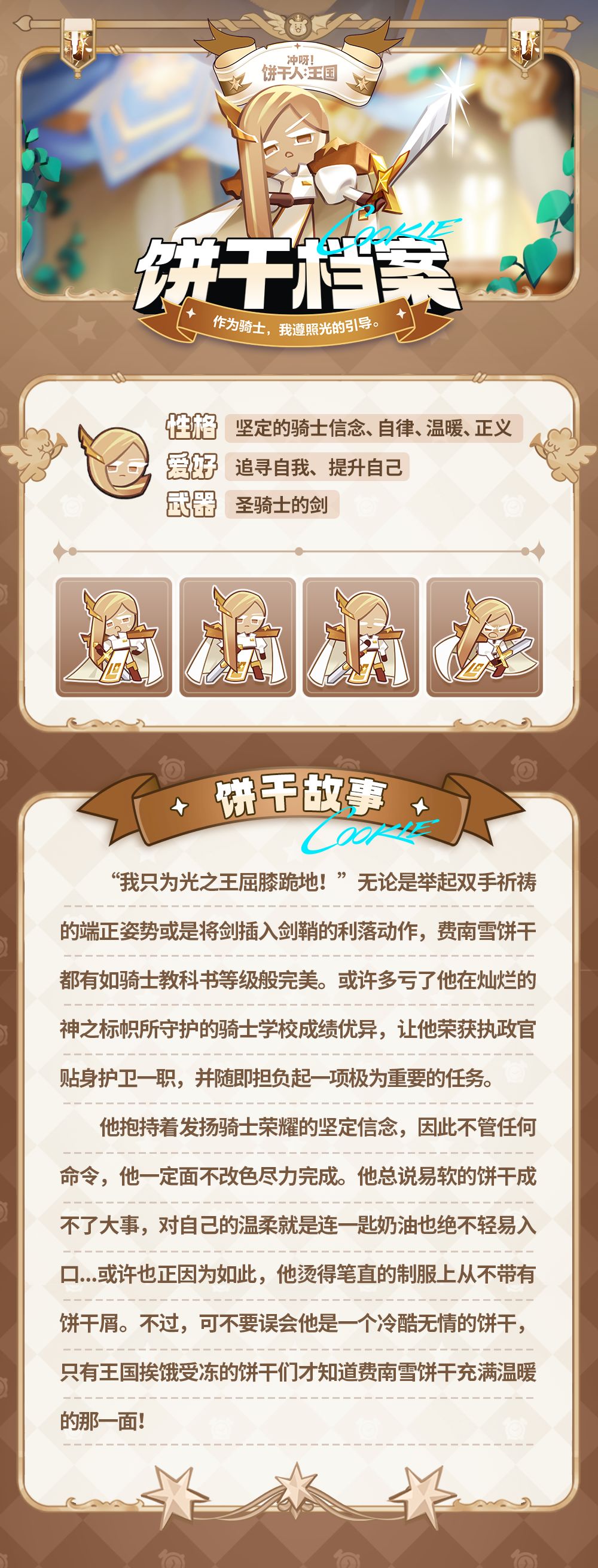 无论是举起双手祈祷的端正姿势或是将剑插入剑鞘的利落动作,费南雪饼干都有如骑士教科书等级般完美……他烫得笔直的制服上从不带有饼干屑。不过,可不要误会他是一个冷酷无情的饼干,只有王国挨饿受冻的饼干们才知道费南雪饼干充满温暖的那一面!