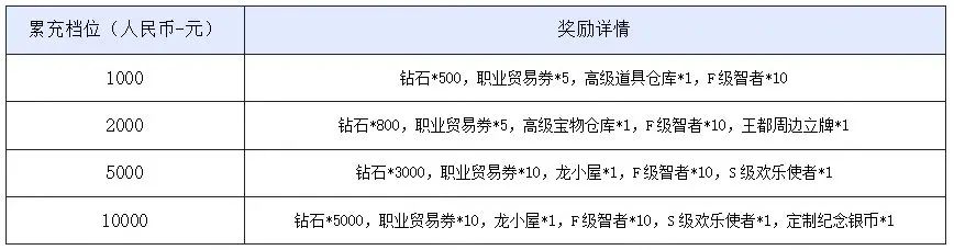 本活动统计【活动时间内】游戏账号(不论是否重开)在《王都创世录》的终身累计充值金额,游戏内直购和官方网页充值平台皆纳入统计。每档奖励每个账号最多获得一次。