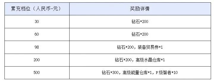 累计充值档位奖励每档单独结算,如:累计充值达到200元,则可获得30元、60元、98元、200元奖励各一份。
