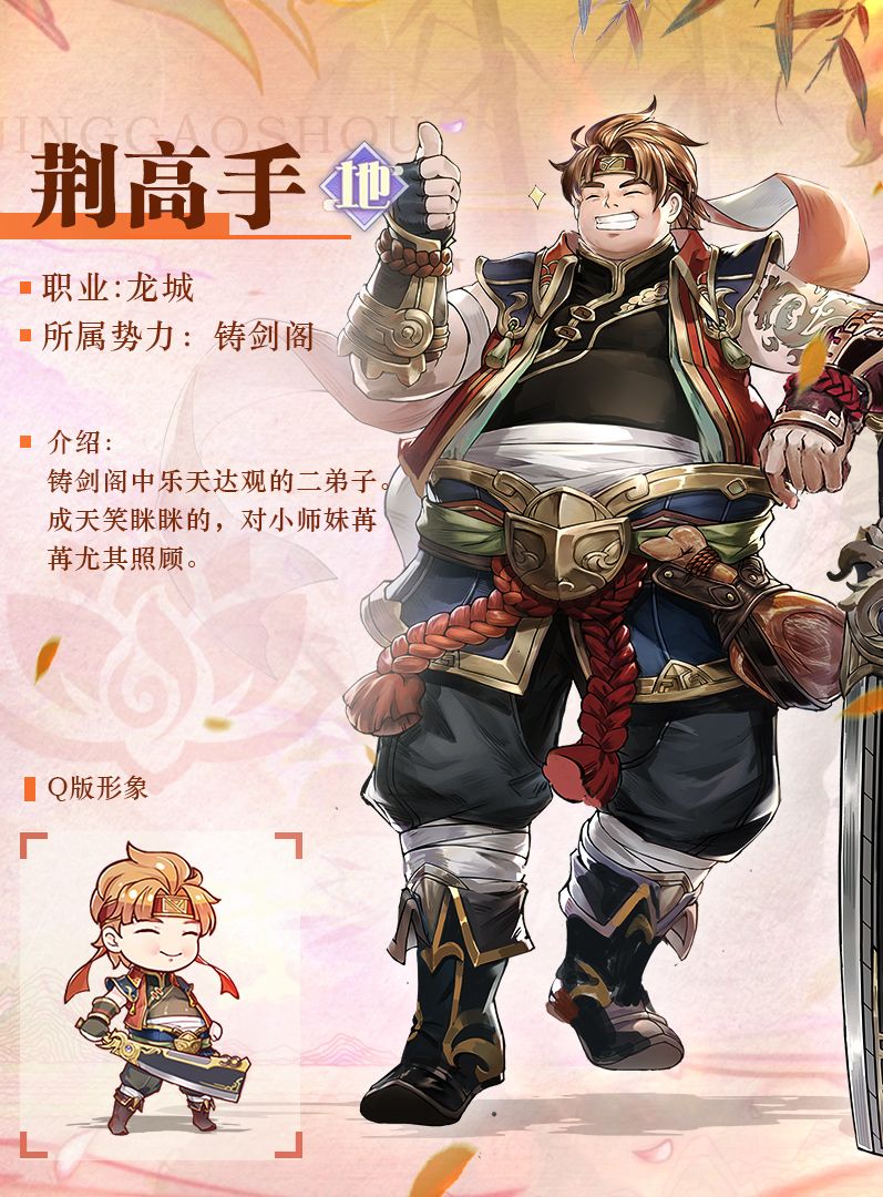 以上就是小荆的介绍了,但三好肥仔小荆的魅力还是要阁主亲自去游戏内体现哦,顺便说之前介绍的小荆、碧影、苒苒以及之后叶云天,都是铸剑阁成员,也是阁主上线之后必送的角色哦!