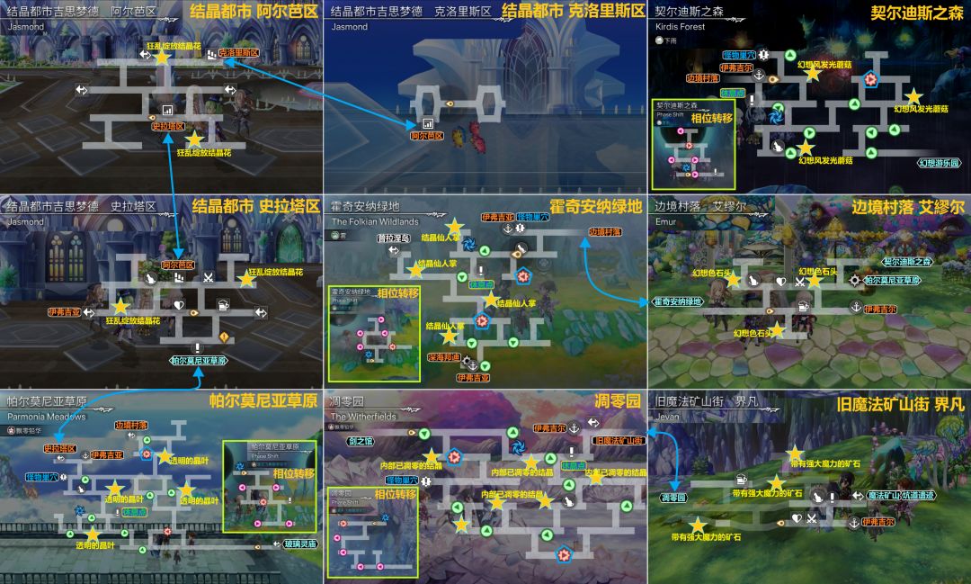 狂乱绽放洁净花-结晶都市;幻想风发光蘑菇-契尔迪斯之森;结晶仙人掌-霍奇安纳绿地;幻想色石头-边境村落 艾繆尔