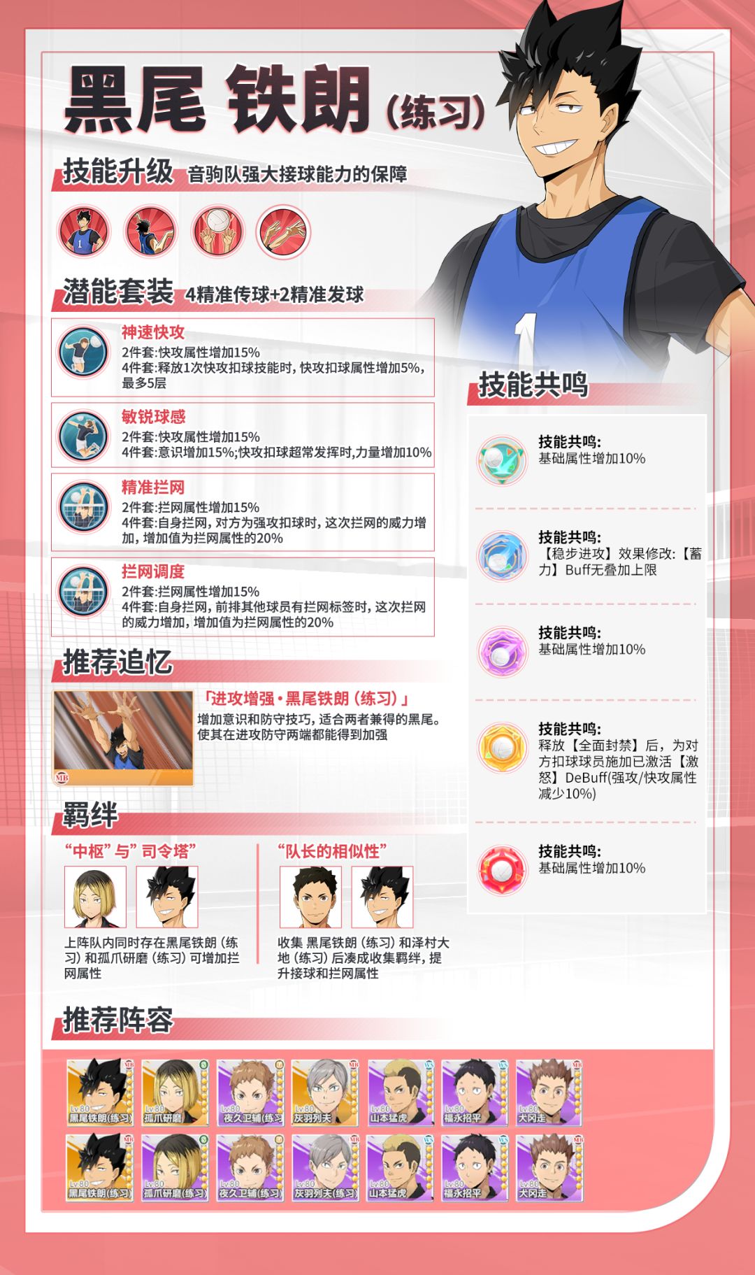 🎈带你一张图了解「黑尾铁朗(练习)」最适合的潜能套装、最适配的追忆、技能共鸣介绍、角色独特羁绊、优质阵容组合!