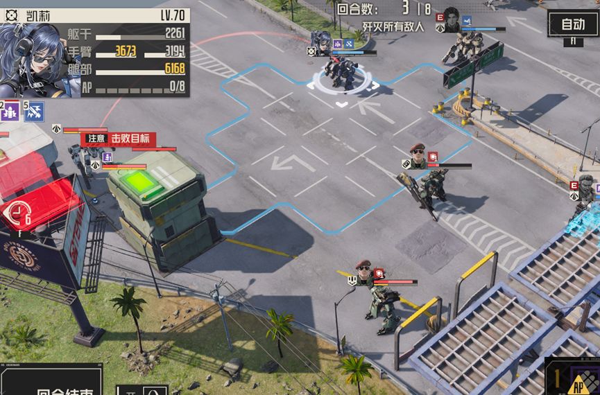 凯莉补刀消灭敌人,前压攻击中间大盾兵