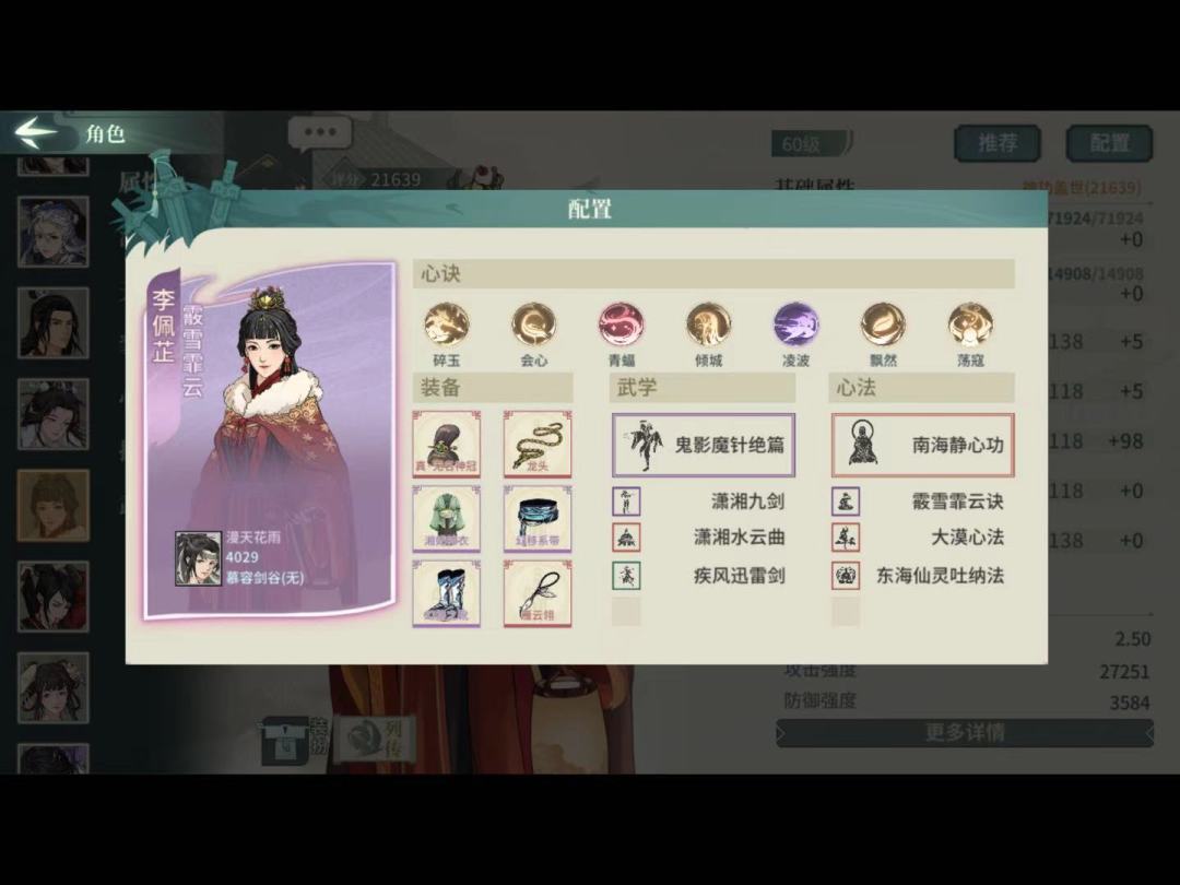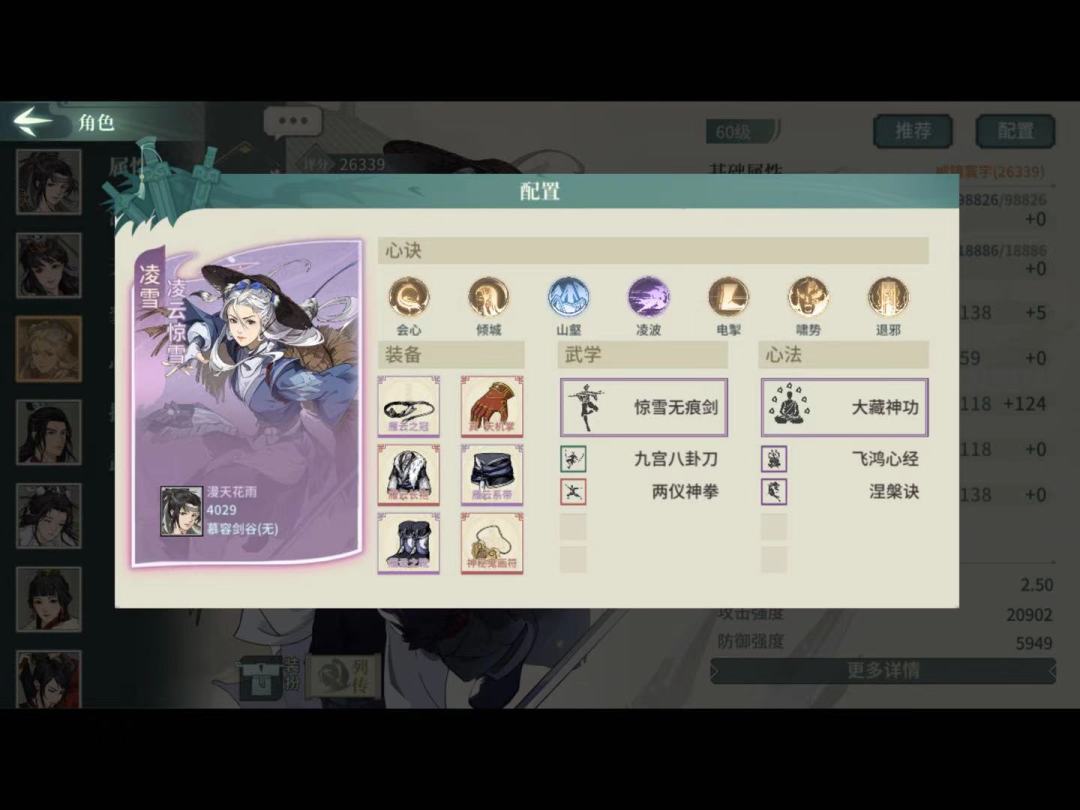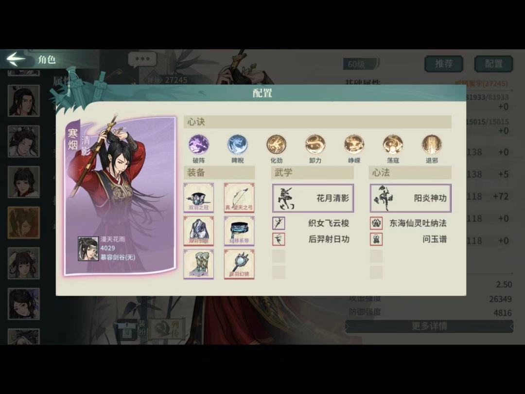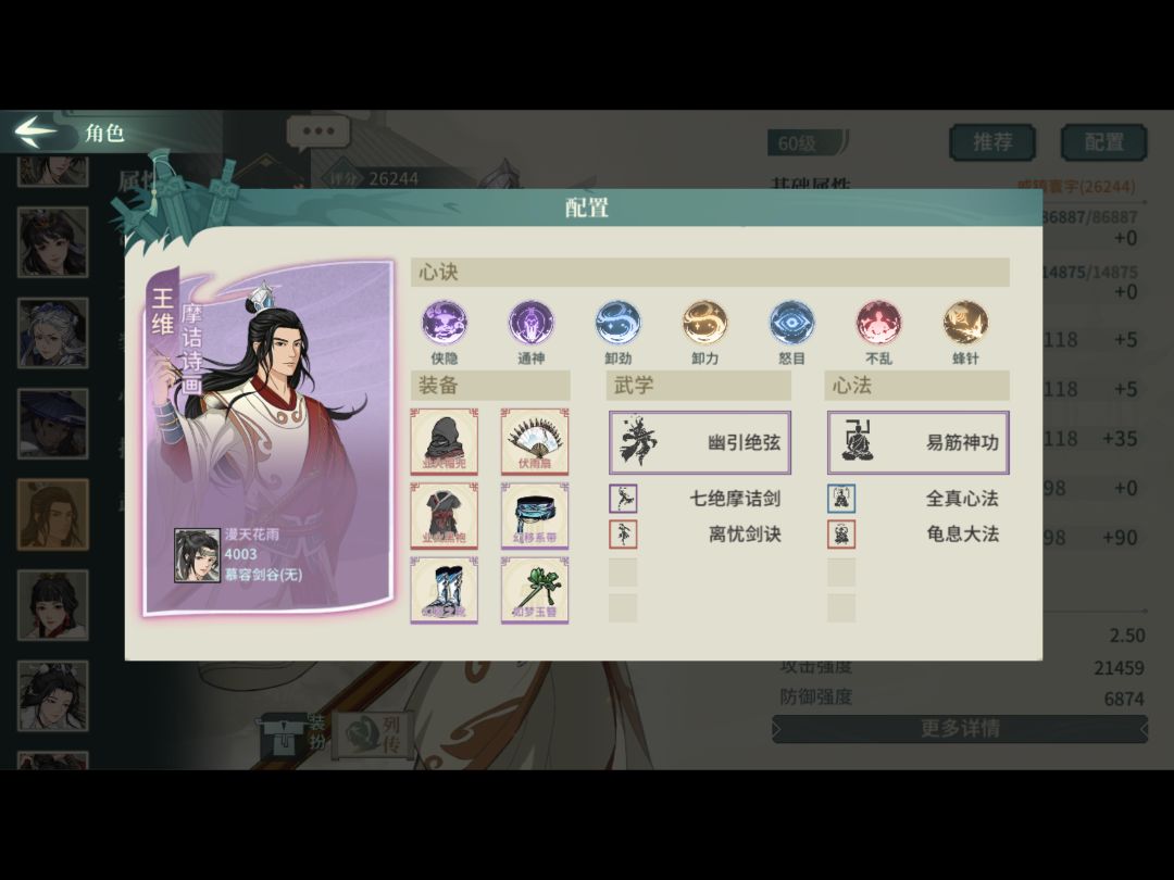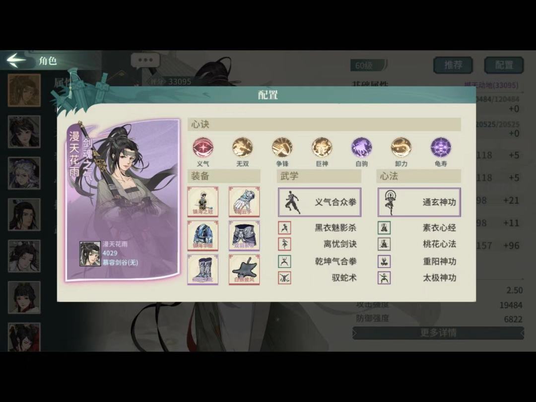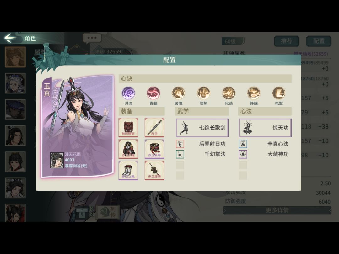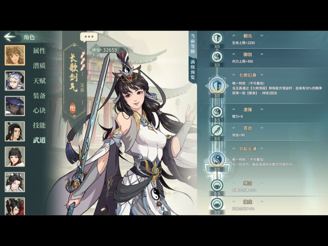 武学必须3突,这套心决只用了33,所以潜质没3突的也能凑合用(但大部分应该都满突了吧)。装备全臂力,顺序43021。武道第二个选等差剑气,第一个我选的易容,替身提升生存,有王维在转移负面不如生存。这套唯一缺点是破阵头没命中,被闪避怪压阵玉真就一直盯着闪避怪戳,前期命中没叠起来又打不中。修改的话大体就是辅修破幻换疾风迅雷剑,电掣换破幻这样子,身法不够到2.5可能得上退邪这些身法心决。