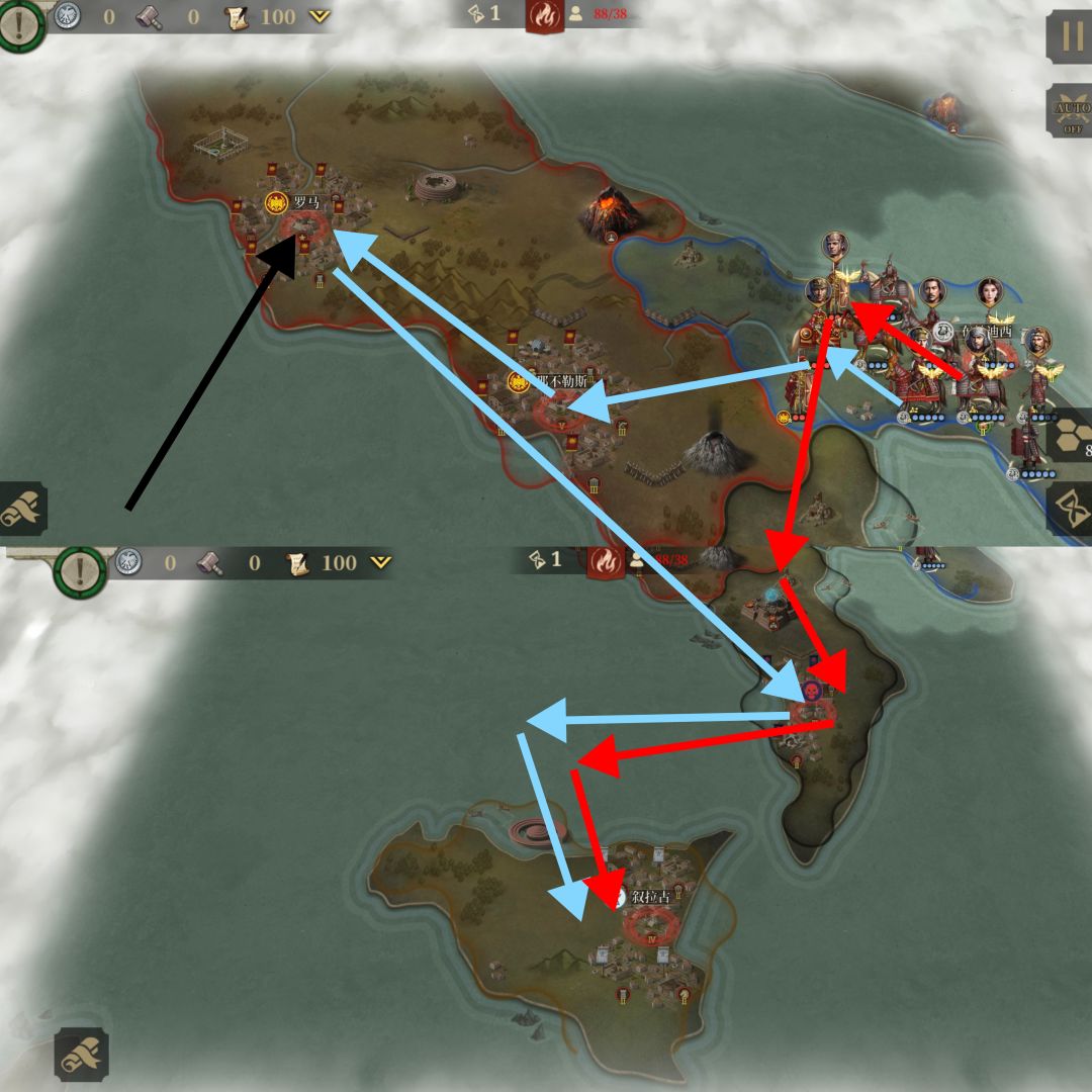 并在随后的几回合迅速朝罗马进军,争取在接触罗马外城之际两回合内拿下罗马;