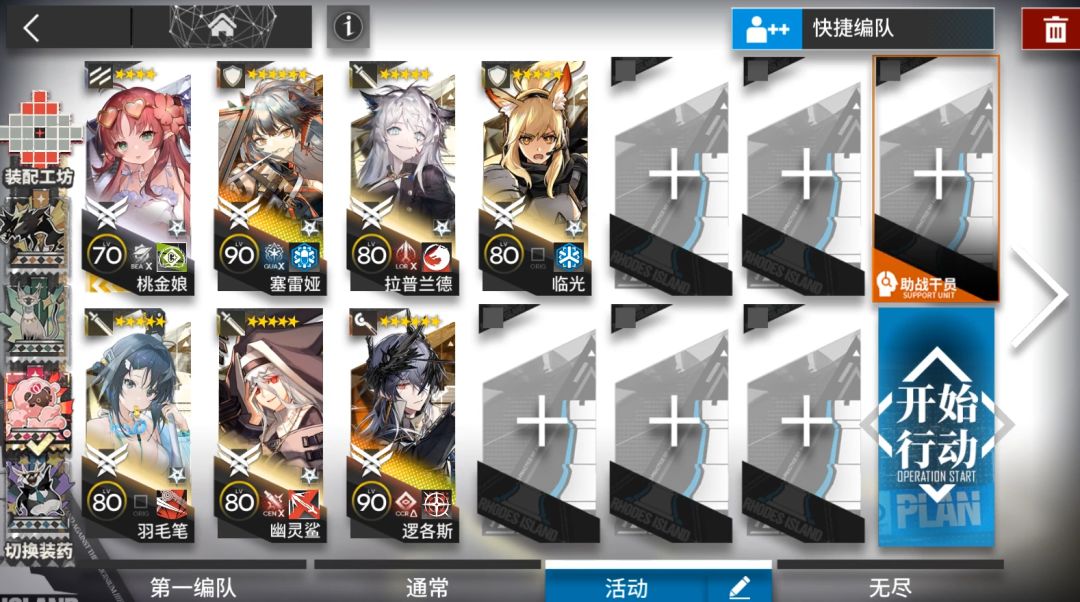 依次部署桃金娘朝右、lgs朝上、塞雷亚(地面特种改成狮蝎在lgs上面第二格,伊桑在lgs上面第三格)羽毛笔、拉普朝右、临光、幽灵鲨朝下挂机到结束。
