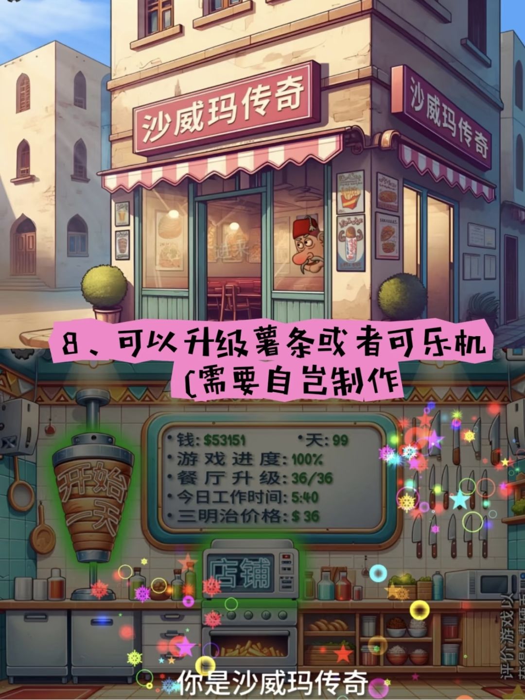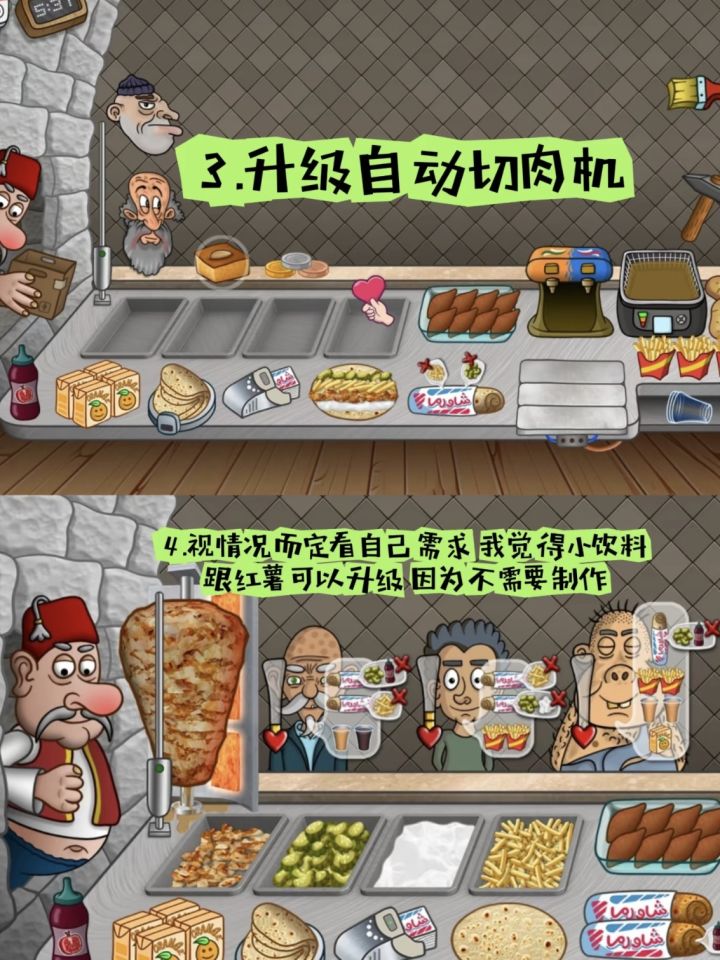 升级思路:主线升级自动化设备(卷饼相关的)~与钱直接相关~副线小吃饮料类(可以直接上架,不需要自行制作的)