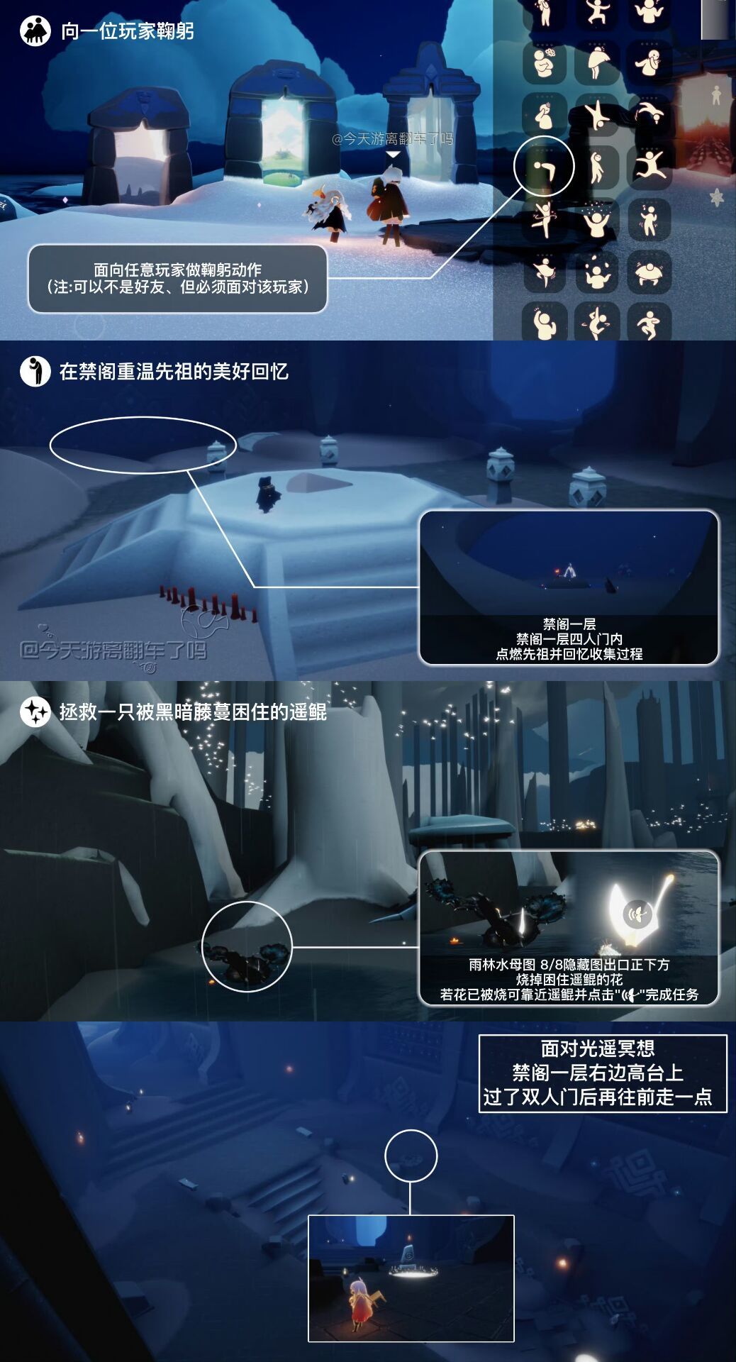 《光遇》游戏中每天的每日任务及大蜡烛的位置都不相同,玩家完成每日任务及收集大蜡烛都可以得到丰厚的兑换奖励,奖励可以用于兑换各种动作及道具,不过很多小伙伴不知道每日任务怎么做,又懒得自己去找大蜡烛的位置,我们汇总了每日任务的完成攻略以及蜡烛位置,一起来看看吧!