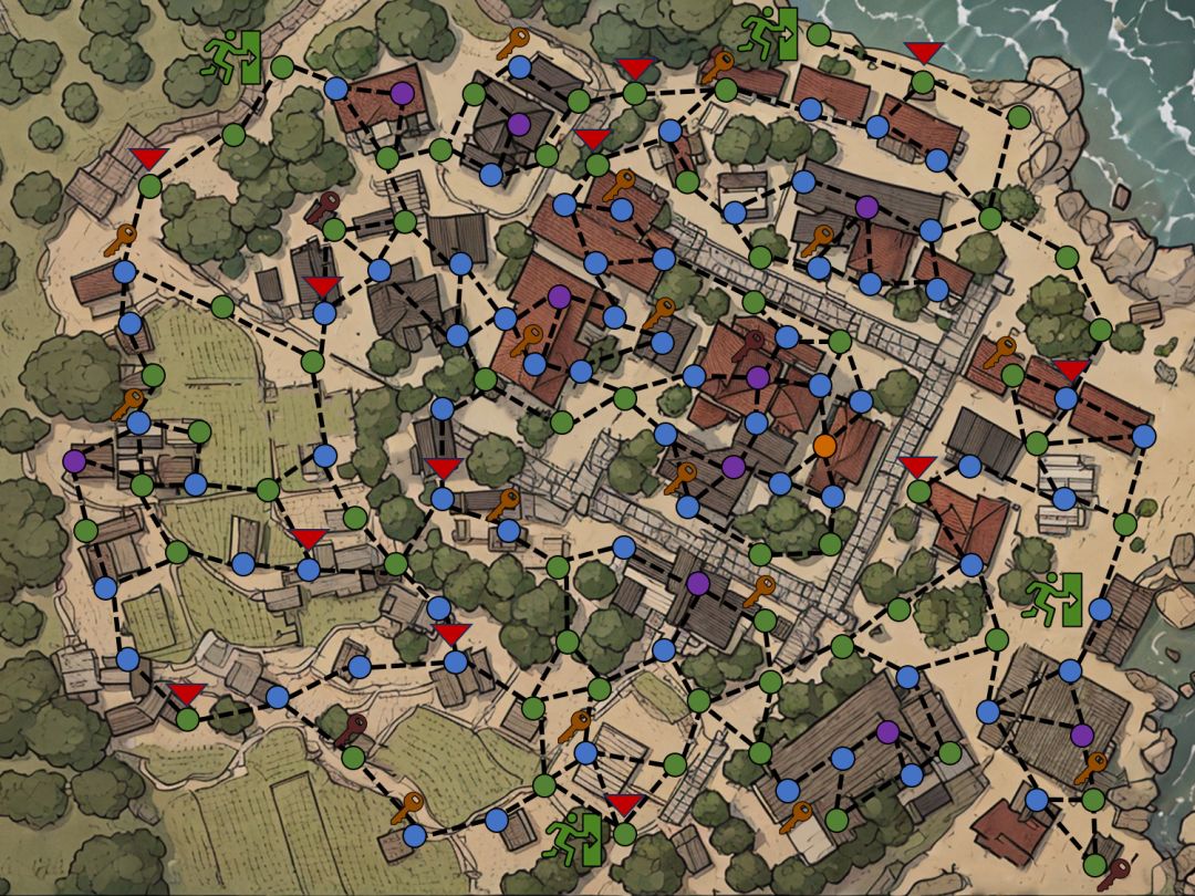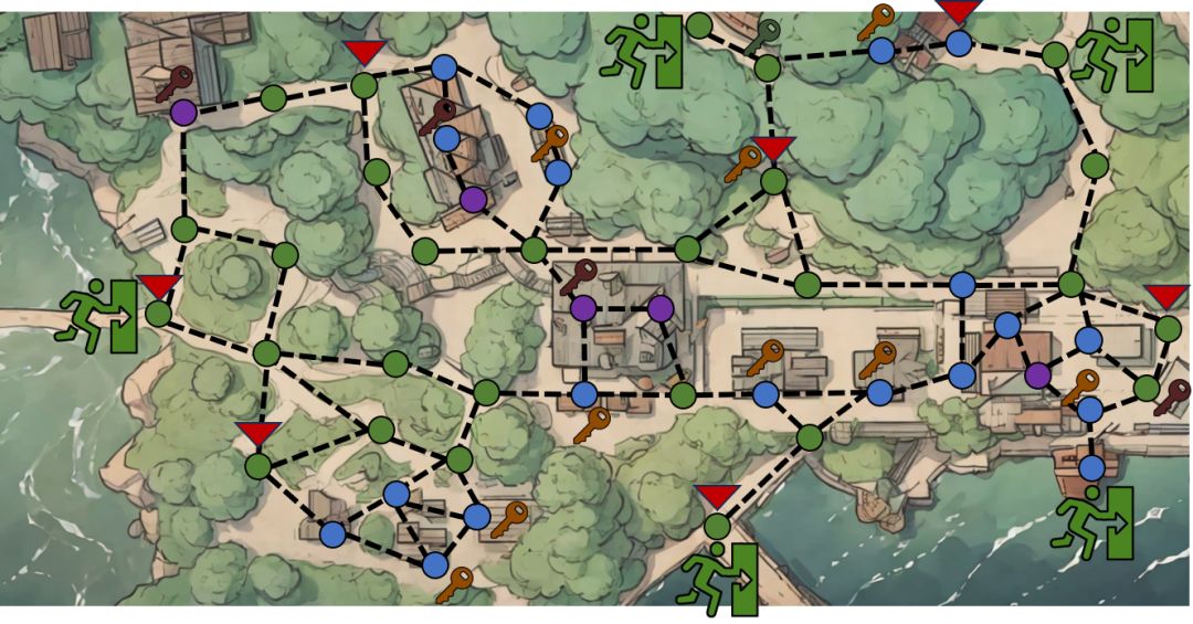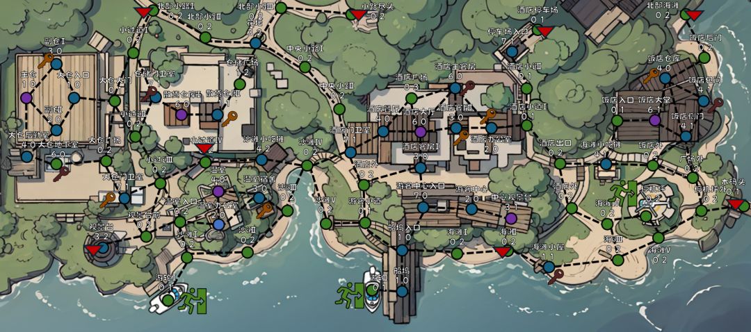 郊区路线图,三角形为玩家及AI复活点,最上方撤离点未实装