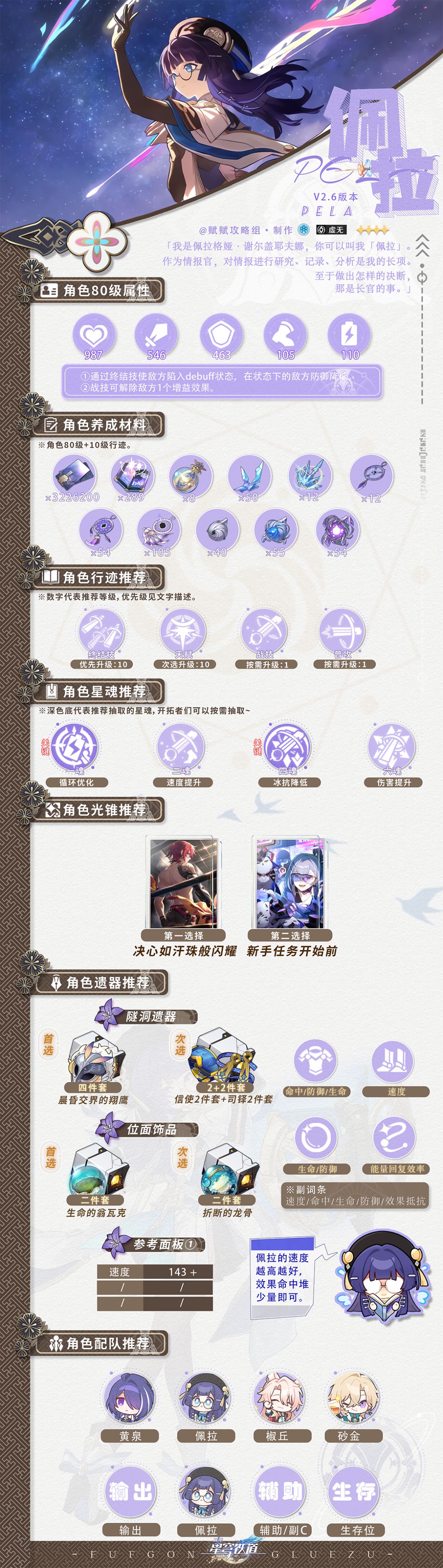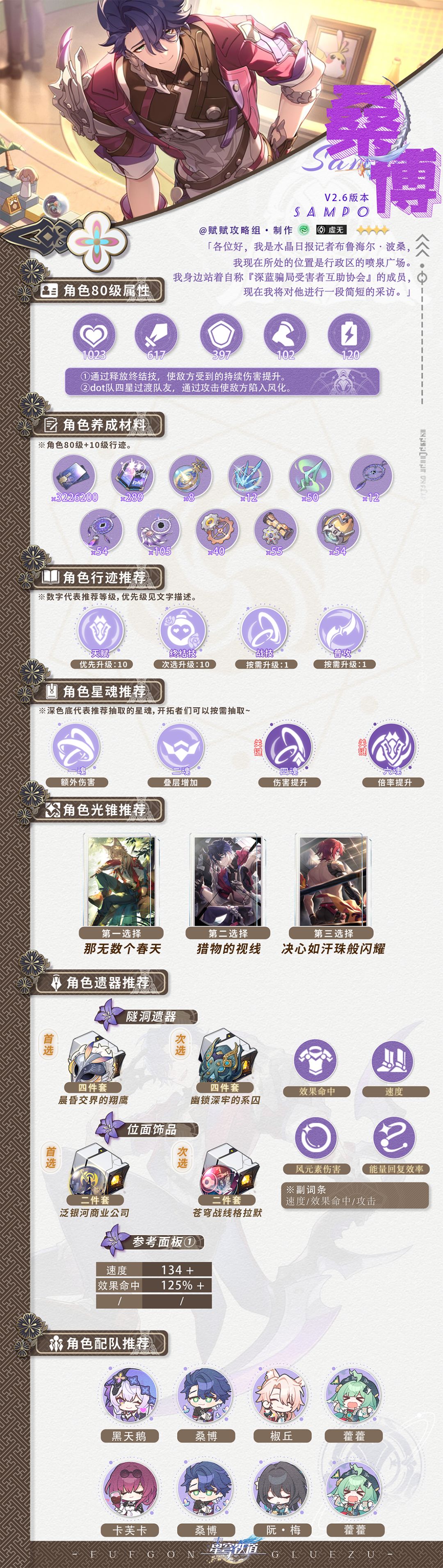 hello各位开拓者们好~今天带来的是2.6版本下半卡池的【黄泉】、【砂金】、【三月七】、【佩拉】、【桑博】一图流养成攻略。