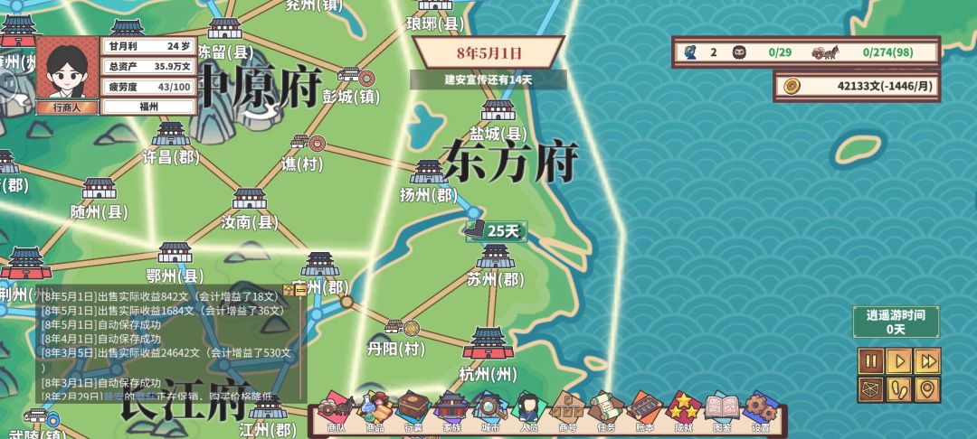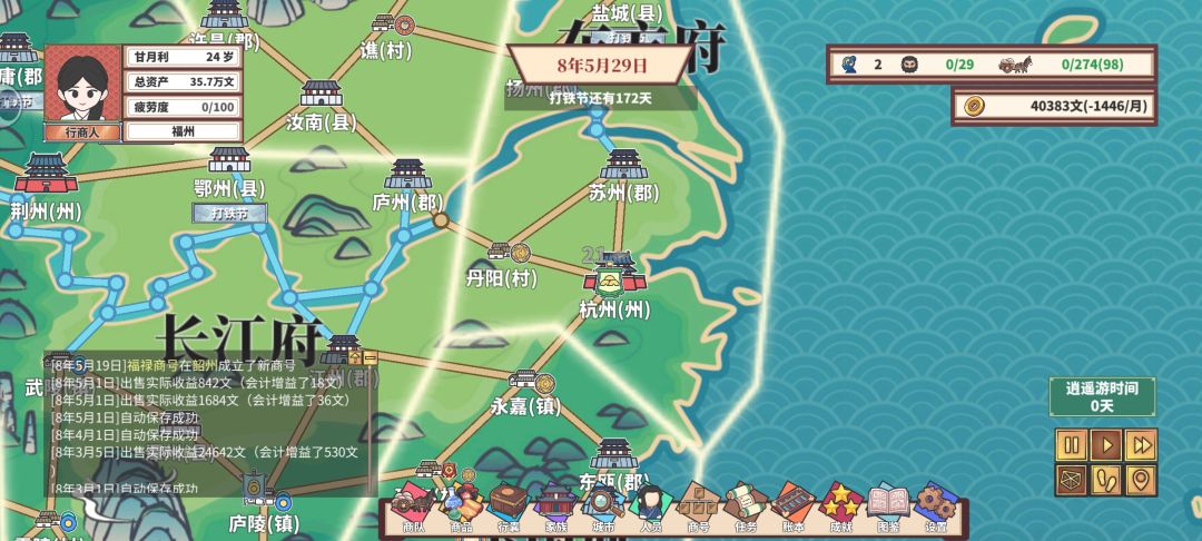 在城市里客栈和住宅休息后时间会自动开始流动,这时候不管是看城市里的市场和事件时间都在流动,除非从城市切出来自己暂停,不敢休息一休息出来一看过好几个月。