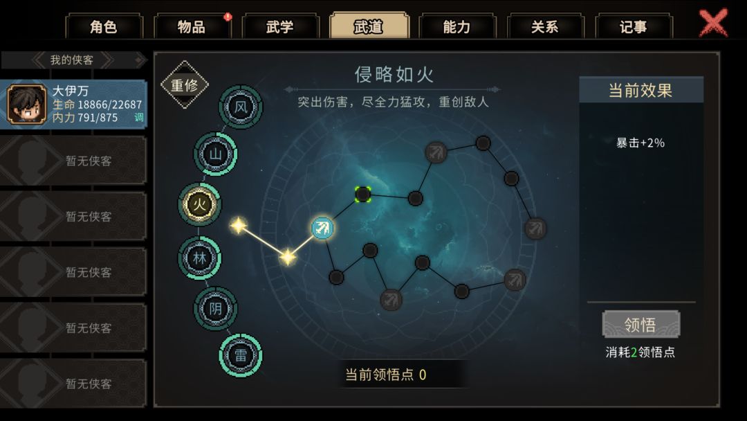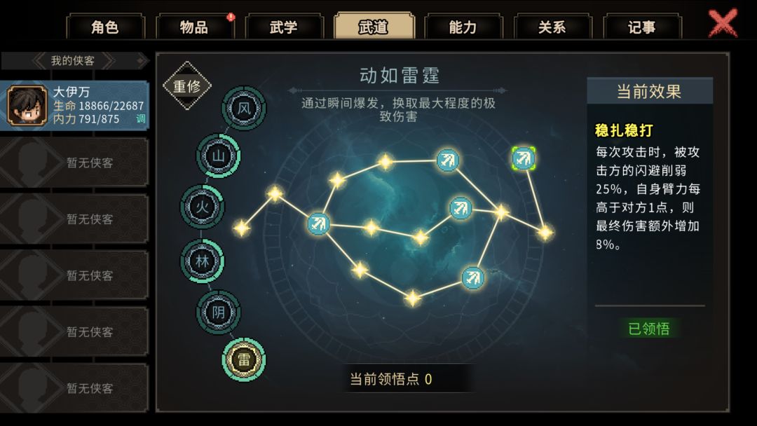2. 集气:虽然走肉盾流,但集气不能低,低了你打的不如对面加的快。选了替天行道、道法自然、身如鬼魅、身先士卒、手脚灵活