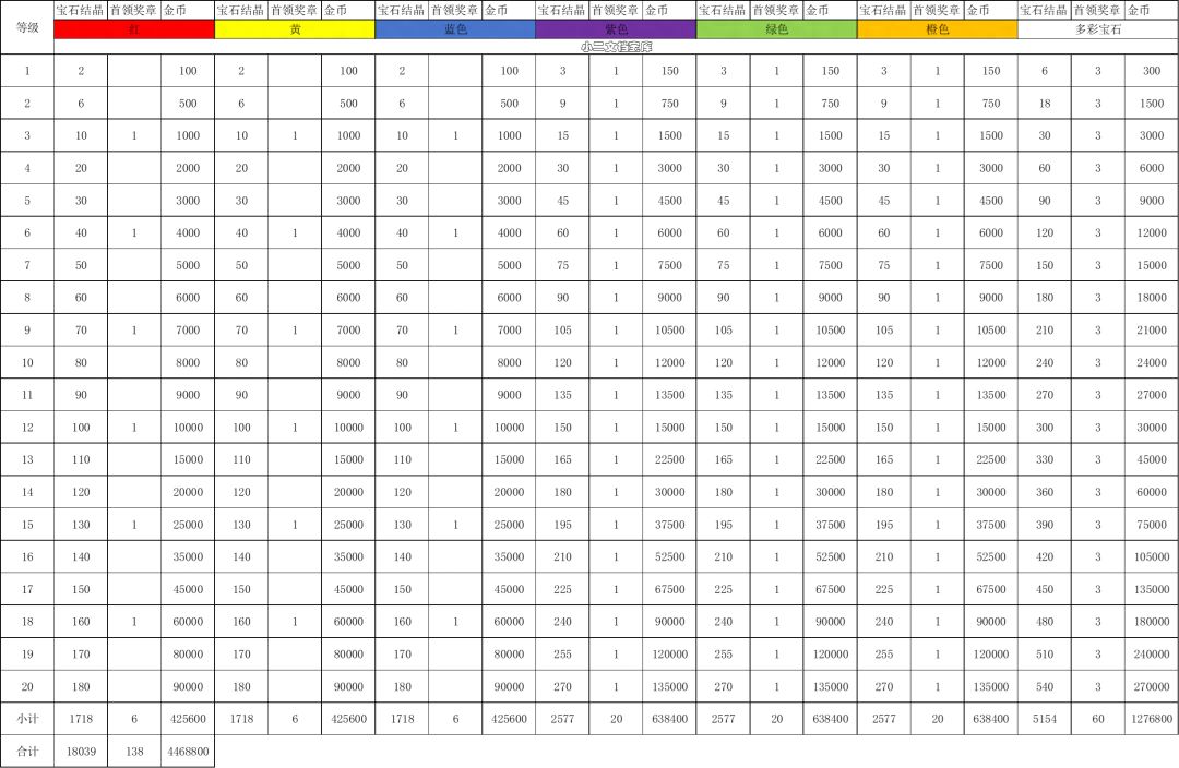 其中红黄蓝、紫绿橙消耗分别相同的,所以这里也将最初的表格做了一个简化。从345级版本宝石最高是20级,全部拉满需要18039宝石结晶、138首领奖章和446万金币,换来的属性提升是800点攻强和护甲、4000点生命和20%的三维提升。这里将宝石结晶和首领奖章都换算成地下城调整券,全用券刷的话需要3693.82张地下城挑战券。