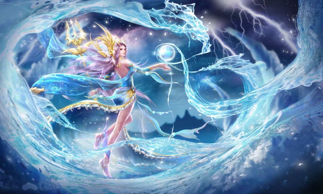 水幕天华:发射水流,对身前直线范围内的敌人造成大量魔法伤害,如果敌人处于海洋之触IV/V/VI效果下,则使其额外损失当前生命的25%/30%/35%(PVE环境下为技能伤害提升20%/40%/60%)。