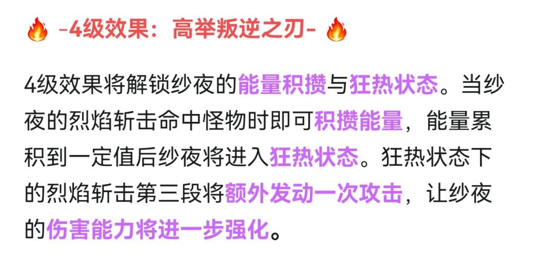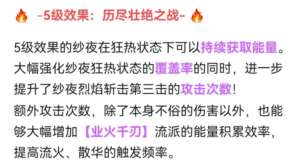纱夜在狂热状态下也能积攒能量,只要纱夜斩击稳定命中就能做到一直保持在狂热状态,且第三段斩击再额外释放一次,到五模为止纱夜第三段斩击一共可以瞬发三次,这瞬发三次的斩击可以瞬间触发俩次业火千刃套装的散华攻击,可以说非常恐怖![[心动小镇_点赞]](https://img-tc.tapimg.com/market/images/17a929b2fb36da6ca1d925a7d08acef9.png)