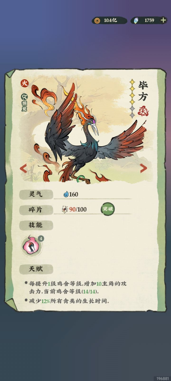 🍎毕方:攻击★★☆☆☆,天赋★★★★☆,没亮点的宠物召唤,天赋1加攻击挺香,加攻击的性价比高于加防御和生命的,虽然都很重要,但攻击可以被爆率*爆伤*终伤乘法放大,效果惊人。天赋2动物产物生产速度加快,可以理解为,下蛋变快了,蛋不管是做菜还是直接卖都可以转化成铜币+门贡,也就是加快了升级速度,而且鸡舍猪窝异兽房三个动物家,里面动物几十个,效果挺明显的,实用的天赋。
