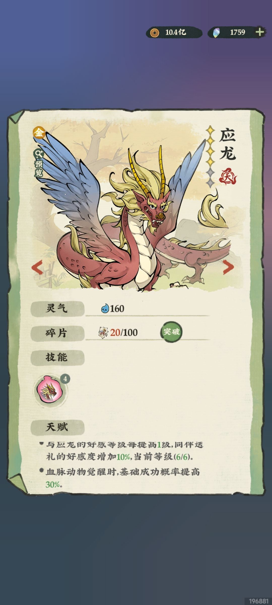 🍎应龙:攻击★★★★★,天赋★★★★★,本游戏最肉的肉盾,且为近战,可以主动靠近敌人吃大量弹幕伤害,单体伤害也还凑合,但是当前版本肉盾只有前中期好用,后期三BOSS轮着搞玩家,还是要依靠走位+无敌帧+回程才行。天赋1神技,加快好感度满级,比如我现在每天好感度能增加5*190,比萌新的5*100香多了是不是?天赋2神技,提高觉醒成功率,跟谛听搭配,都可以试着刷满觉醒动物的图鉴熟练度了。