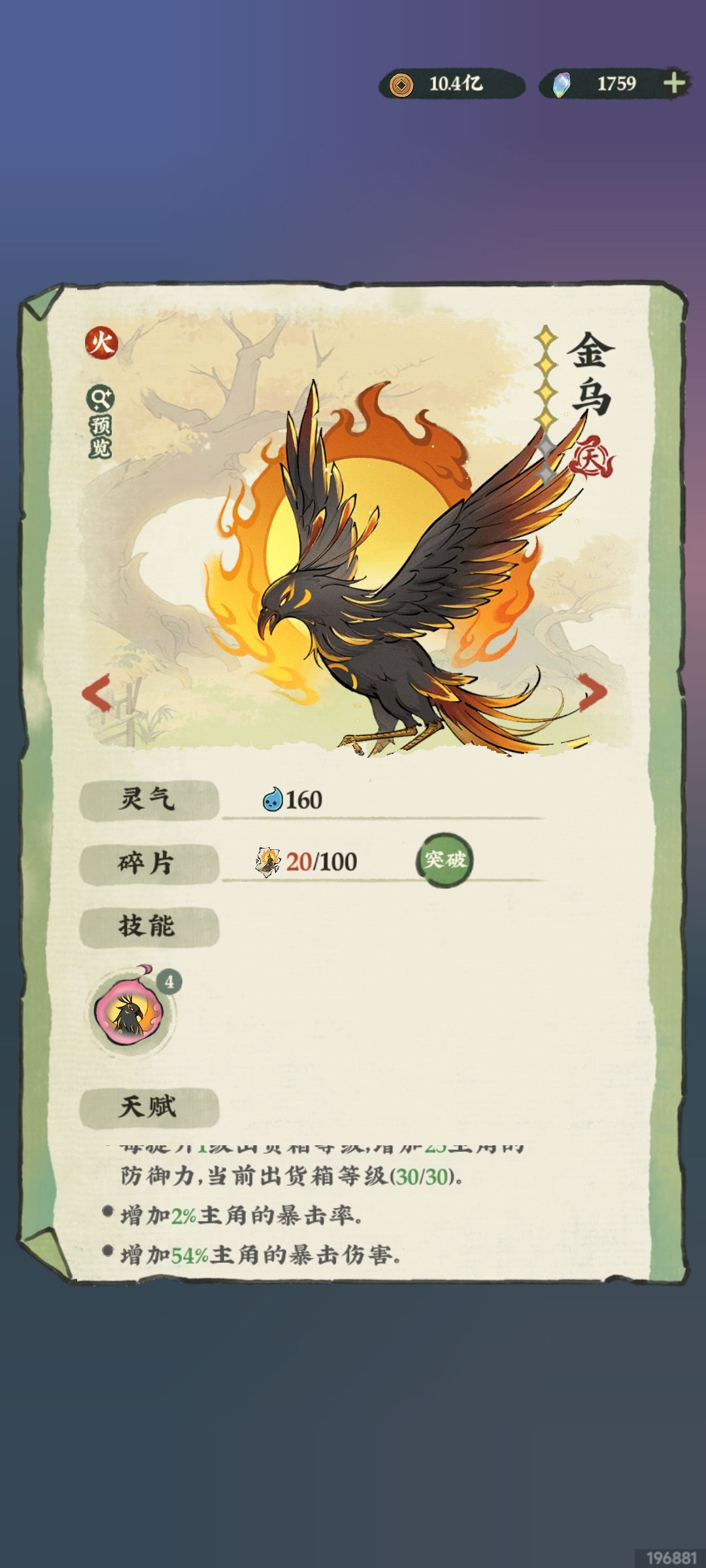 🍎金乌:攻击★★☆☆☆,天赋★★★★★,没啥两点的召唤系技能。但天赋能给玩家带来质的飞跃,推荐每一位新玩家凑齐三宝钱后优先兑换一只金乌,可以提升数百点三维属性攻击力防御力生命值,同时提升爆率+爆伤,为什么这么夸张呢?曾经出过bug,算是给玩家的补偿,不收回这部分bug属性。