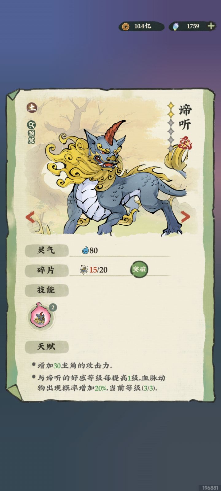 🍎谛听:攻击★★☆☆☆,天赋★★★★★,没啥亮点的召唤宠物,天赋1加攻击挺好,日积月累属性。天赋2加觉醒动物出现几率,有了它,闪光动物数量大幅提升,玩起来更舒服了,搭配后续提升觉醒概率的属性,相辅相成之下,觉醒直接烂大街,不再眼馋玩家,想养啥就养啥。