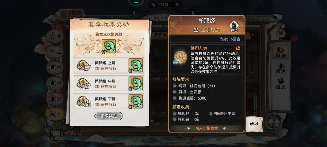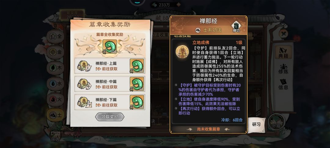 大荒和禅那经是带有石僧的铁桶阵中,最适配,启动最快的功法。是不想购入狂龙的情况下,能为队伍提高坦度的功法搭配。