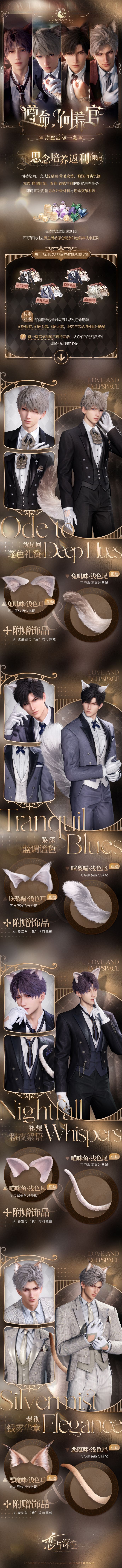 1.本次每套「活动思念配套猫咪执事服饰」「活动思念配套幻色猫咪执事服饰」中均包含对应男主的服装、头饰、尾饰;
