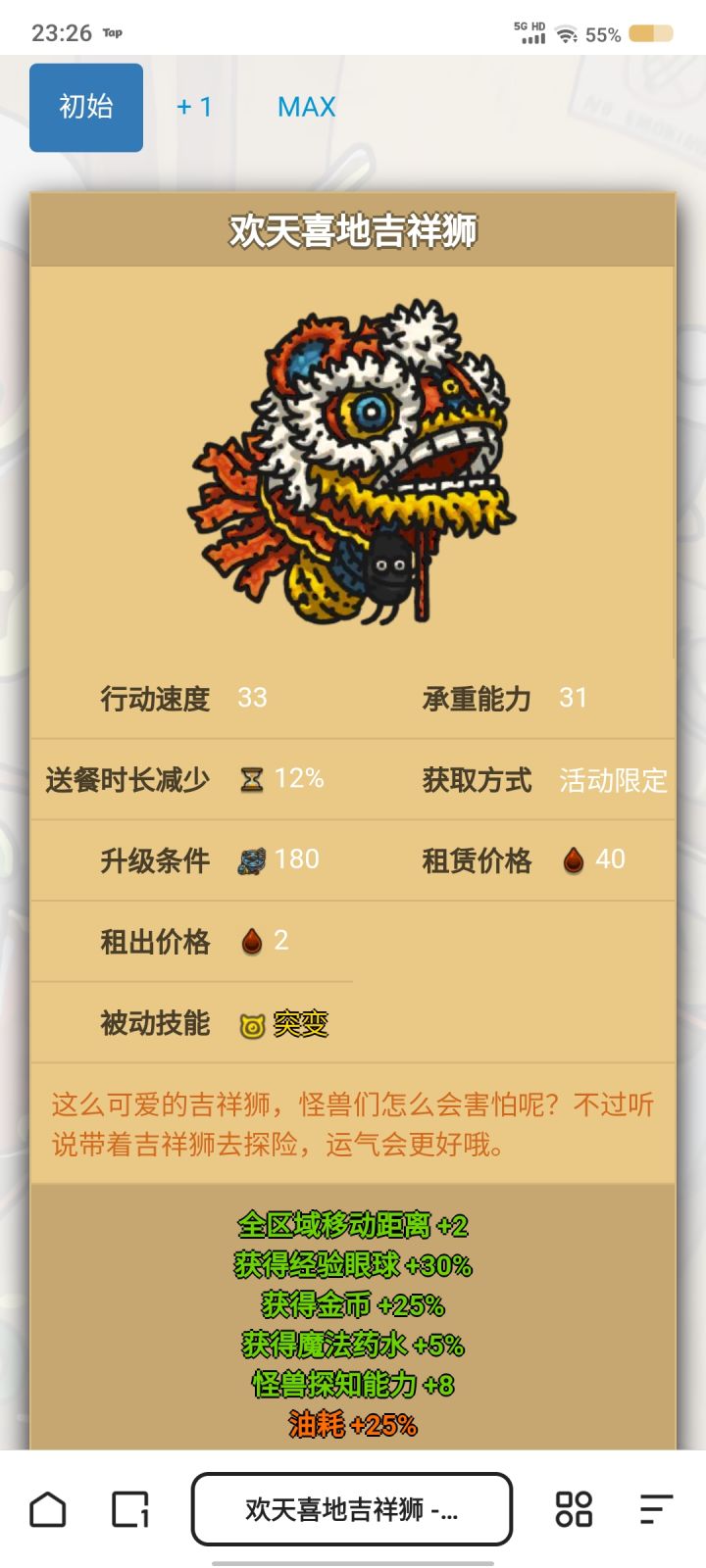 2.max狮子可以+15%药水,是刷药水的主来源之一(但是max狮子需要160+220零件)。