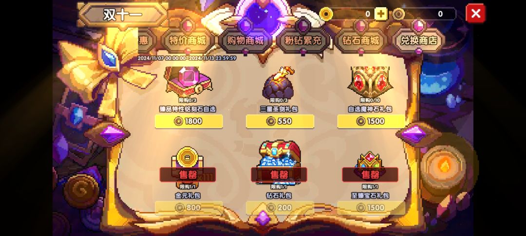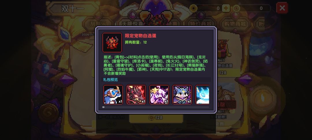 充了74,花68×2=136粉钻,拿下12只宠物+毕业宝石,还可以换典籍跟一些经验还有钻石,这次双十一对于中后期没啥可换又想补宠物的小氪玩家还是很不错的