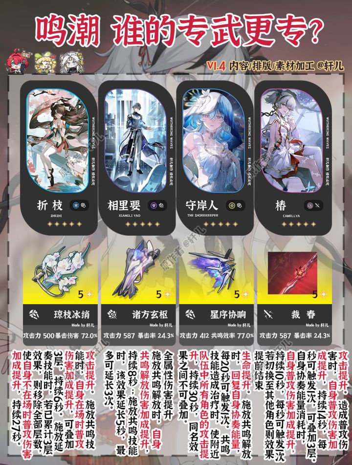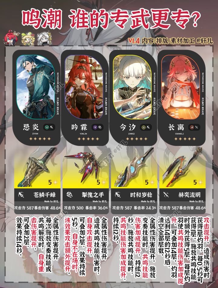 鸣潮目前一共8个限定角色和8把限定专武。理性讨论,哪把专武更专一点,哪把专武泛用性更高~