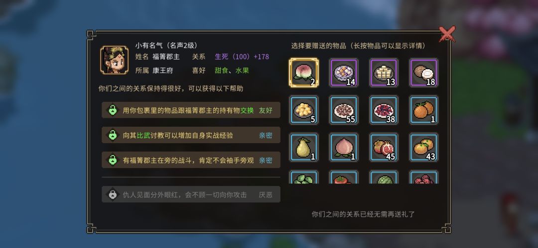 ①自身名声比对方每高1级,送礼效果提升20%