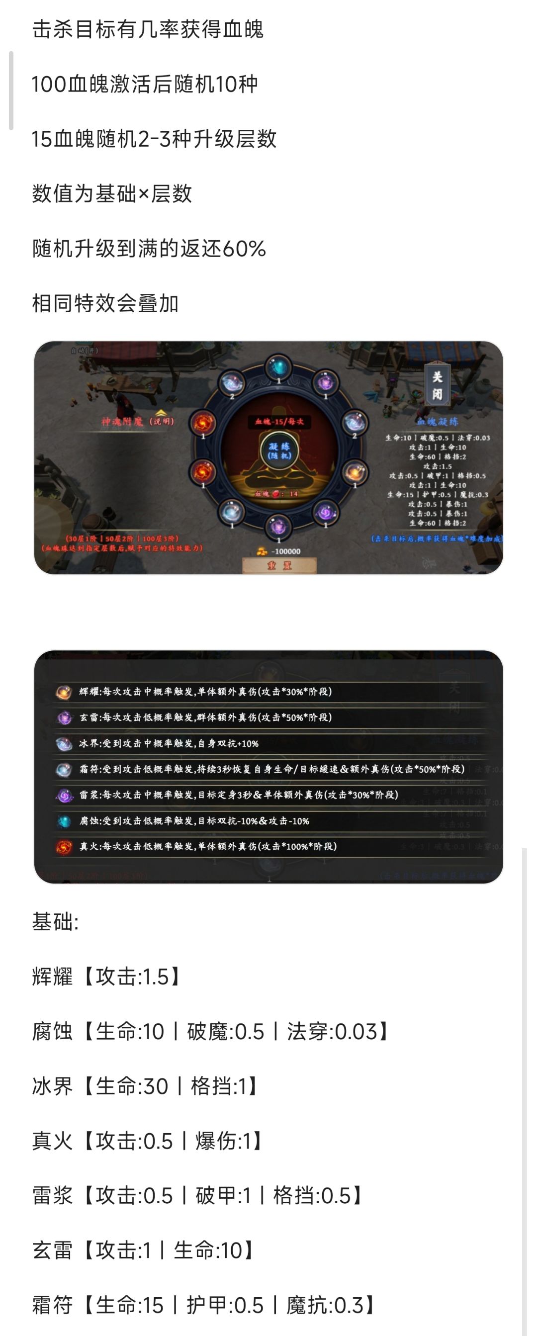 30层之后会赋予特效,根据自己玩的英雄随机出想要的血魄后再升级,个人建议至少要有一个【雷浆】,定身效果很好用。