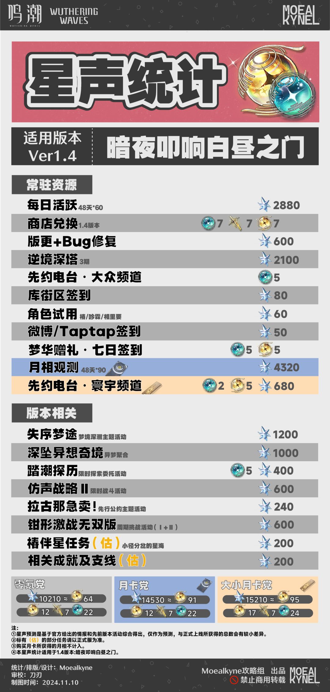 各位漂泊者早上中午晚上好呀,这里是Moealkyne,本次给大家带来的是1.4版本【暗夜叩响白昼之门】前瞻星声统计表!